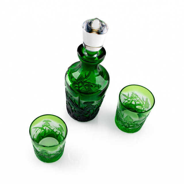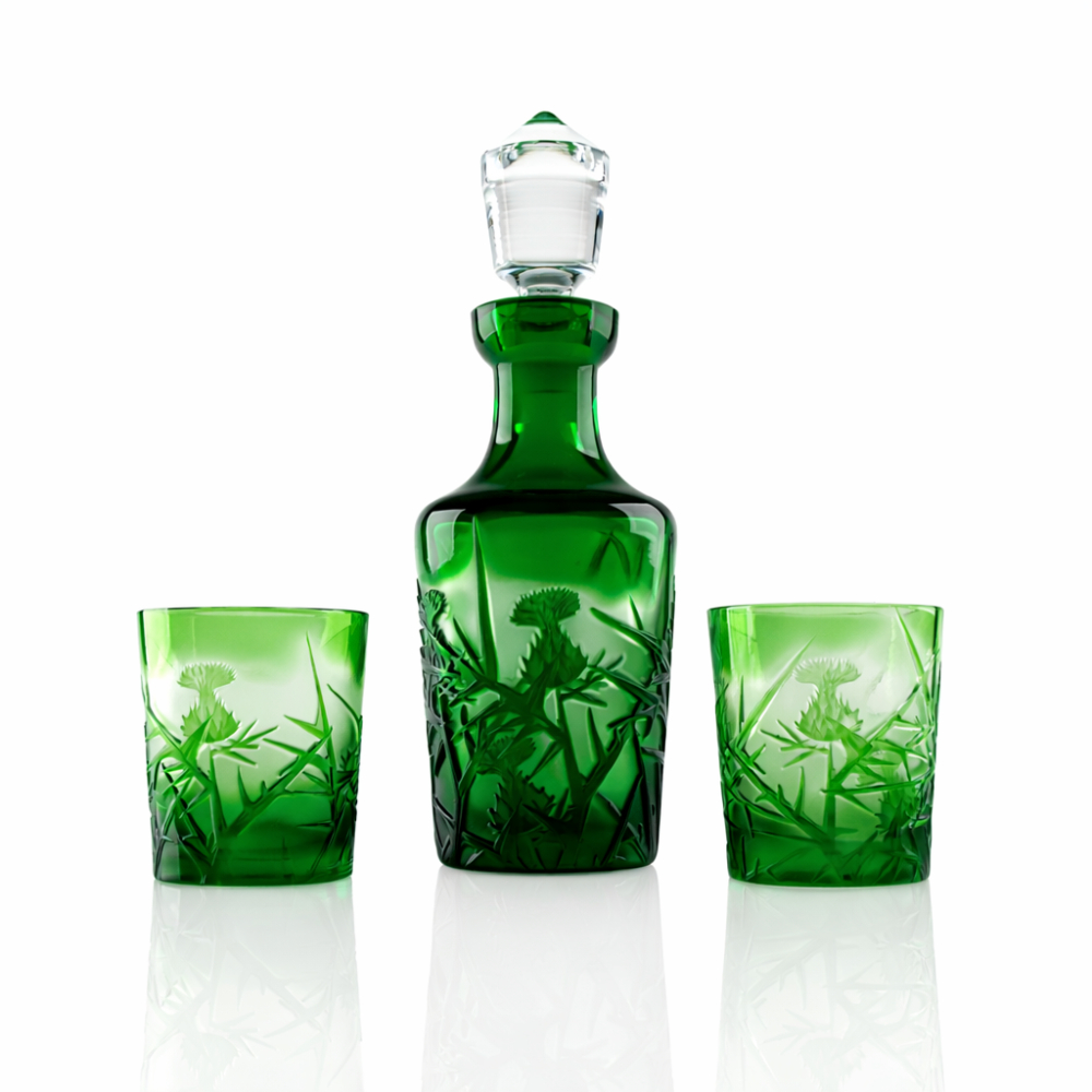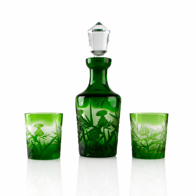 Elegantní whisky set s motivem bodláku zaujme na první pohled svou sytě zelenou barvou a precizním ručním zpracováním. Set je vyroben z kvalitního přejímaného křišťálu, který vyniká svou hloubkou, leskem a jedinečným vzhledem.