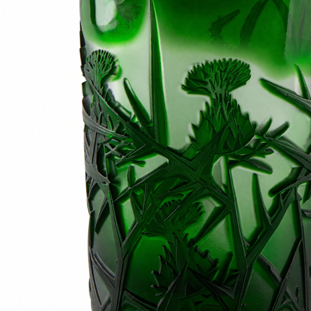Dominantním prvkem je detailně zpracovaný dekor bodláku – symbol síly, odolnosti a elegance. Každý kus je originál, vznikající tradiční sklářskou technikou, která dodává výrobku luxusní charakter.