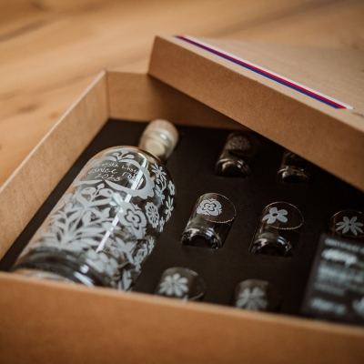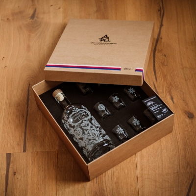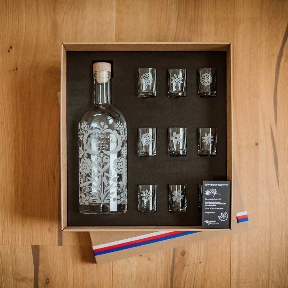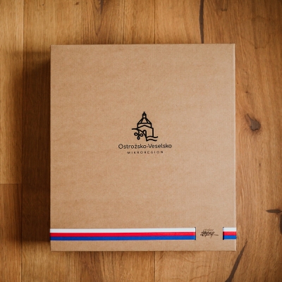 Sklo si žádá hezký a praktický obal přizpůsobený přesně na míru. Každá sklenička, láhev či miska musí přesně zapadnout. Proto si krabice vyrábíme sami, abychom umožnili vznik krásných sad na zakázku, jako je třeba tato Slovácká kolekce na slivovici. Byla vyrobena pro mikroregion Ostrožsko – Veselsko – kraj lidových tradic, krásné přírody, dobrého jídla a pití. Krabice je elegantně dozdobena stužkou trikolóry a vlastním logem regionu.
