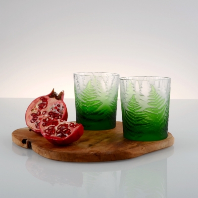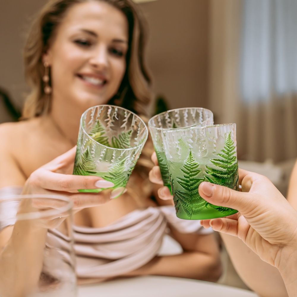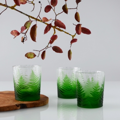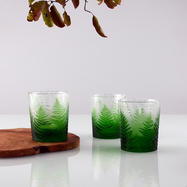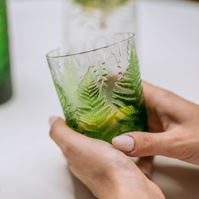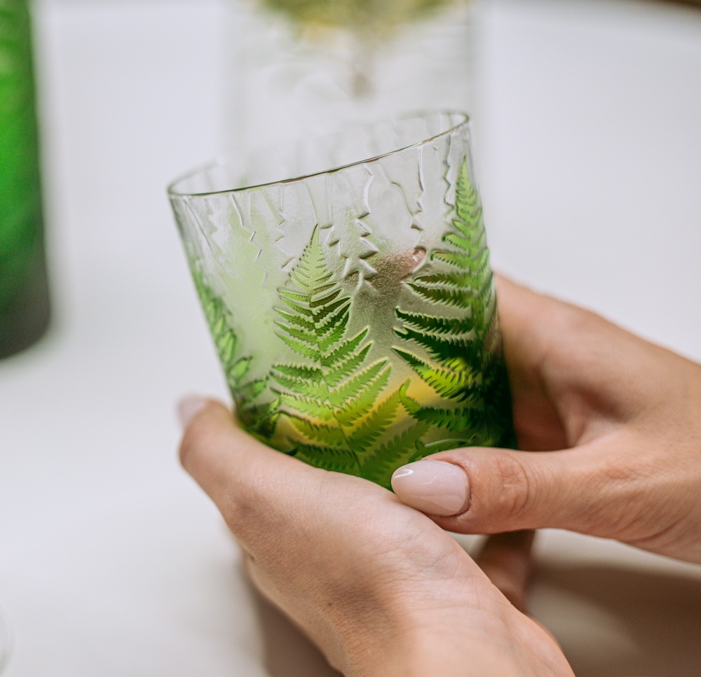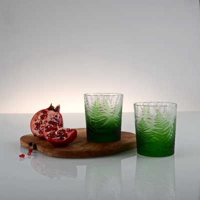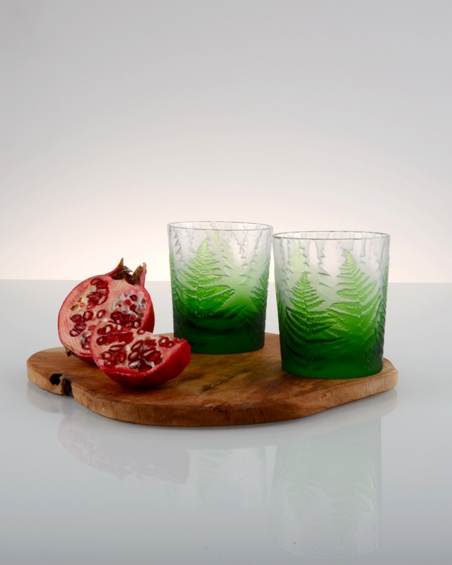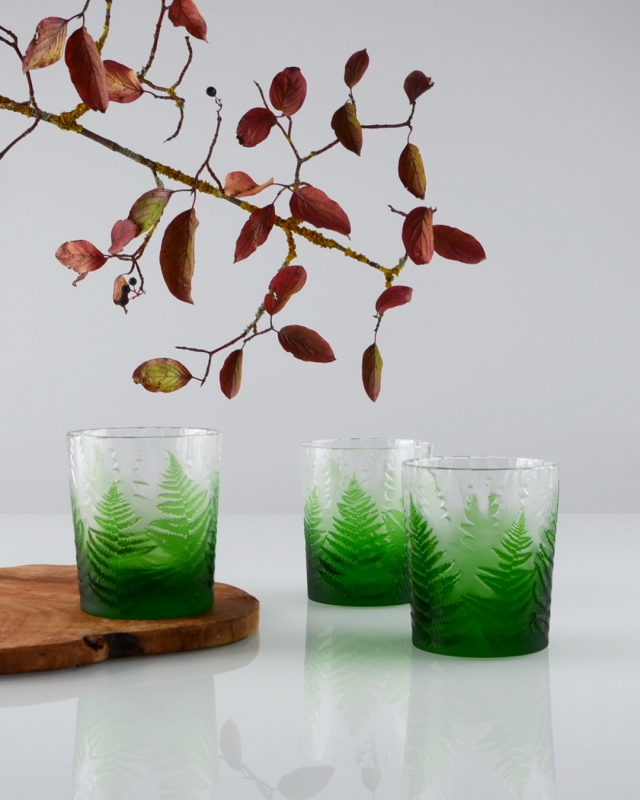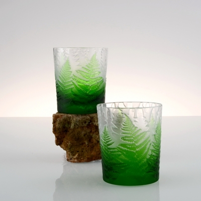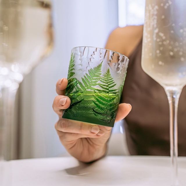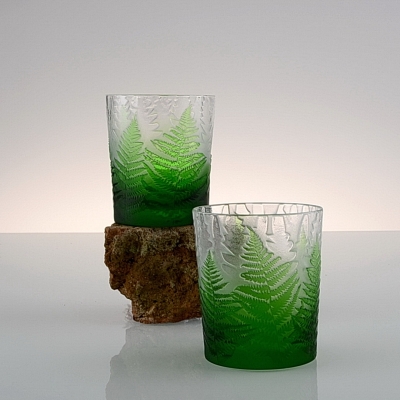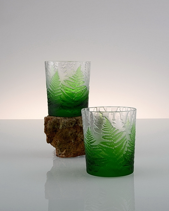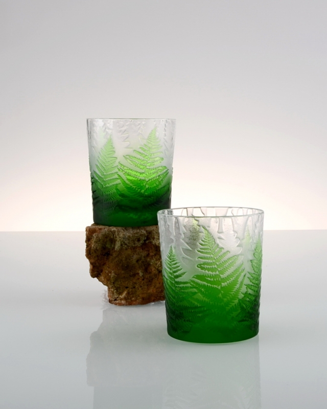 Každá sklenice je malým uměleckým dílem – těžký, barevný křišťál přetváříme jemným pískováním až do čiré krásy. Inspirace? Kapradina a její překrývající se lístky.