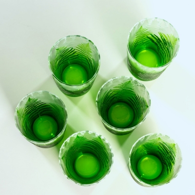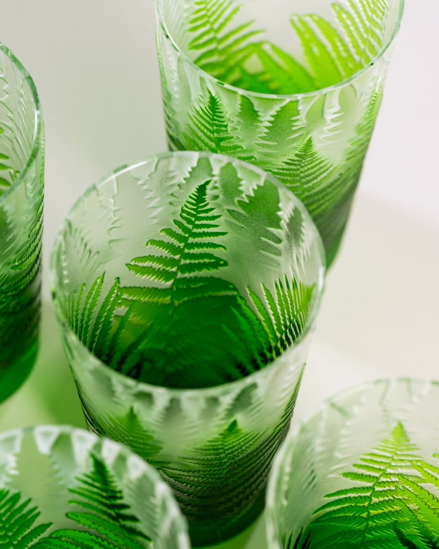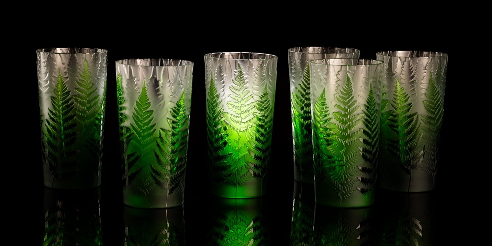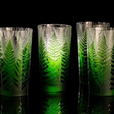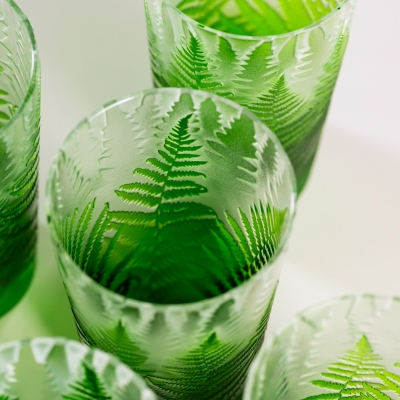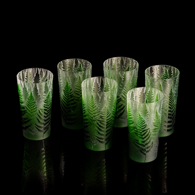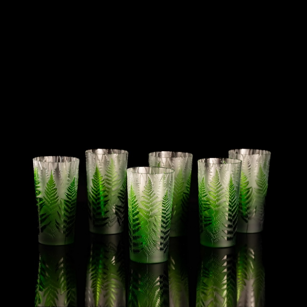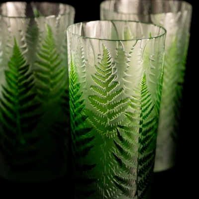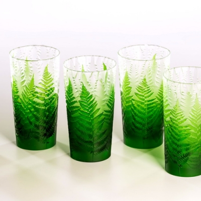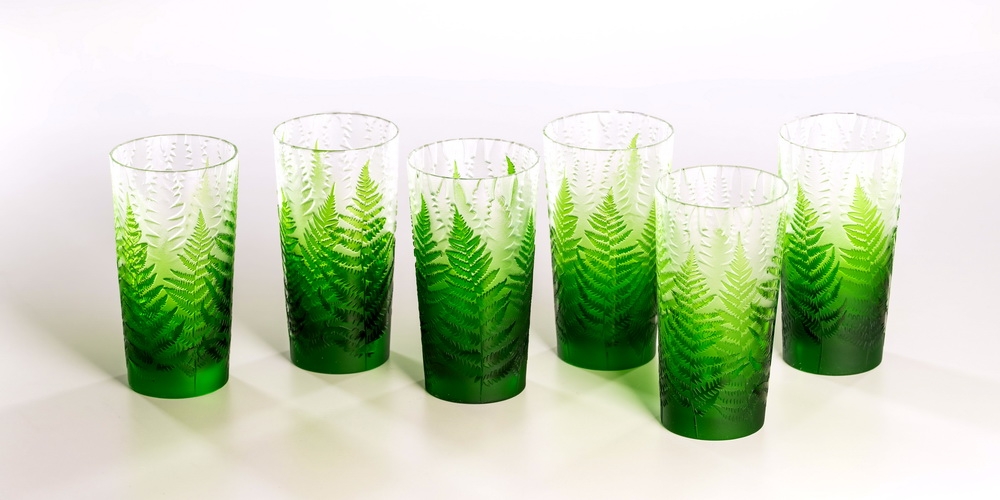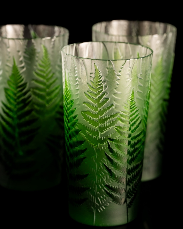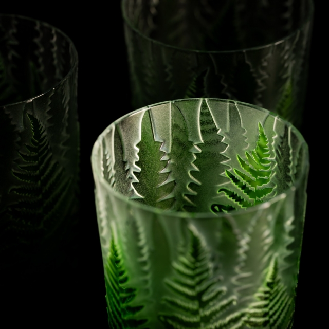 Každá sklenice je malým uměleckým dílem – těžký, barevný křišťál přetváříme jemným pískováním až do čiré krásy. Inspirace? Kapradina a její překrývající se lístky.