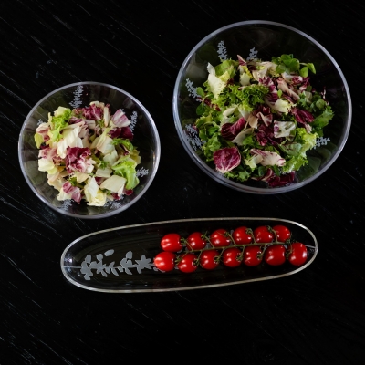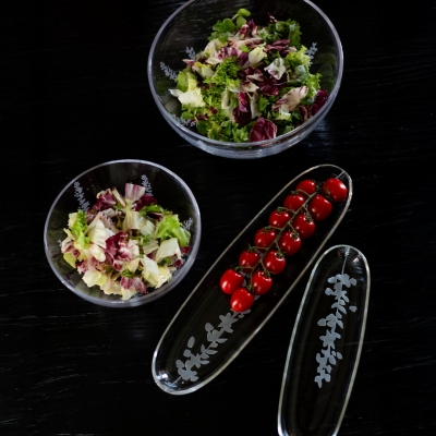 Oválný skleněný tác s jemným motivem mateřídoušky vynikne při každém stolování. Dostupný ve třech velikostech, aby dokonale padl vašim potřebám.
