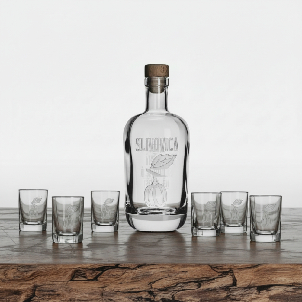 Sada na slivovici - lze zakoupit jen samotnou láhev nebo láhev se 2, 4 nebo 6 štamprlemi.
