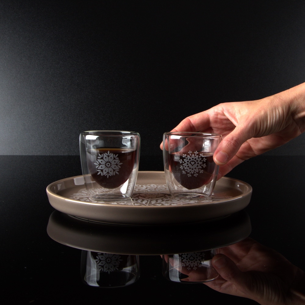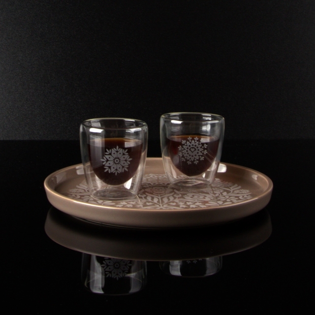 V jednoduchosti je krása a tyto sklenice jsou toho důkazem. Jsou ručně vyrobeny z lehkého borosilikátového skla s dvojitou stěnou, které dlouho drží ideální teplotu, nepálí ani se nerosí. Jsou dekorovány tradičními lidovými motivy metodou reliéfního pískování. Objem 100 ml, ideální na kvalitní espresso!